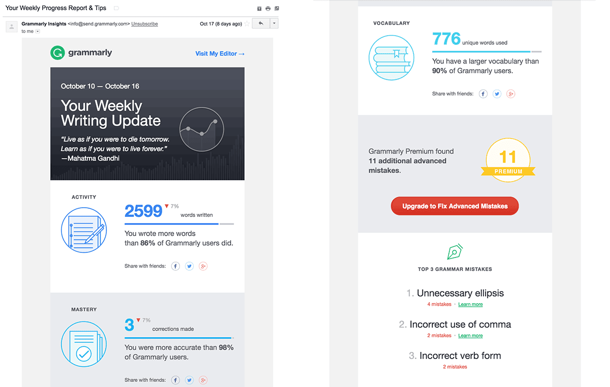 This is also a good way for Grammarly to show its users how valuable the app can be to them, and also to highlight the potential benefits of upgrading to the premium version.